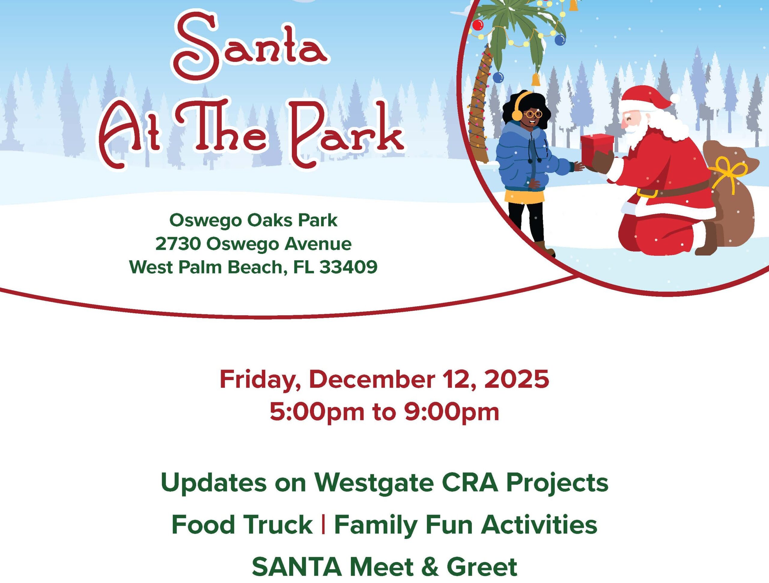 Mark your calendars! Santa at the Park will be held on Friday, December 12, 2025 at Oswego Oaks Park.