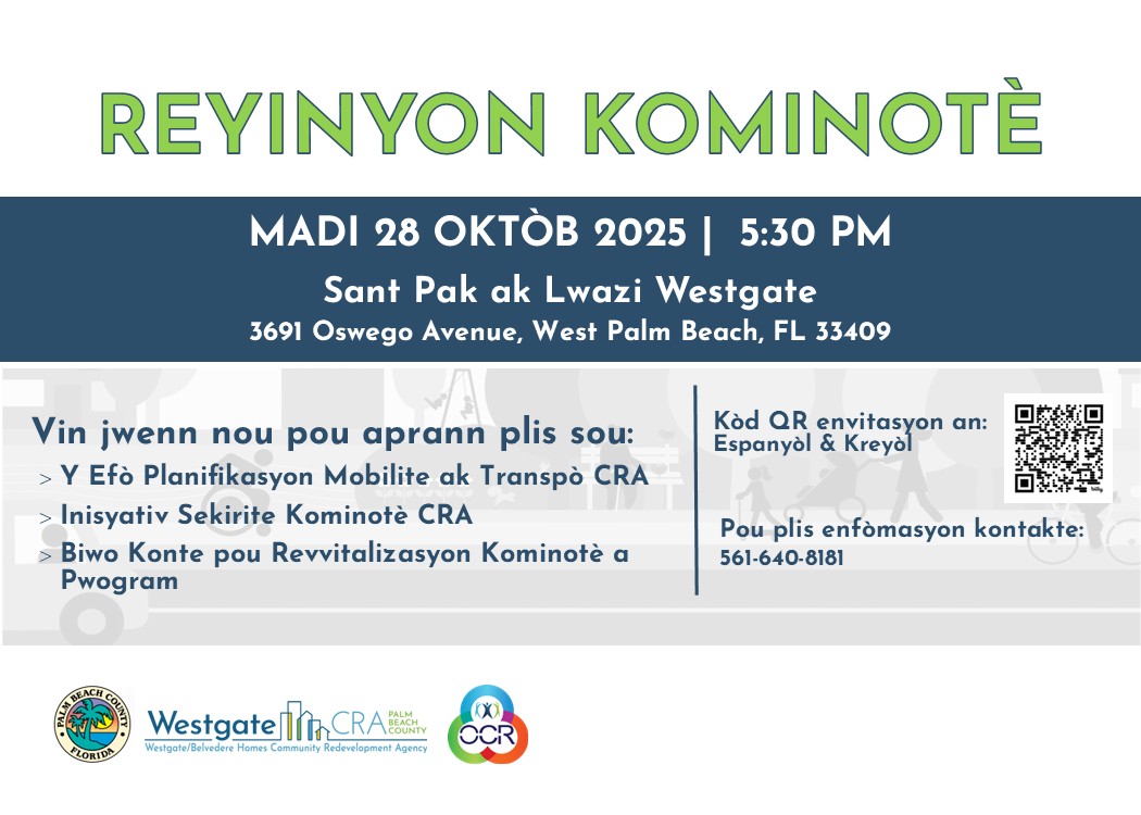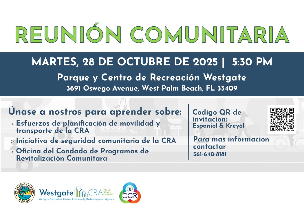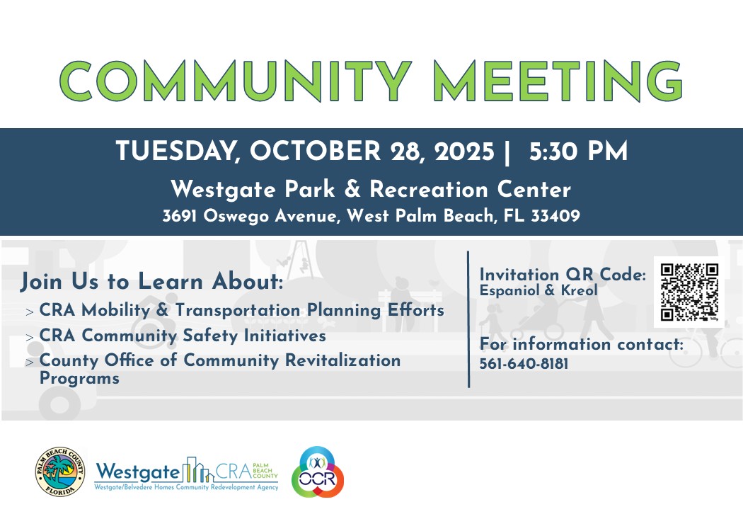 The CRA is hosting a community meeting at the Westgate Recreation Center on Tuesday, October 28, 2025 at 5:30pm. We will be seeking feedback and input from the community on mobility planning efforts being undertaken by the CRA. The County’s Office of Community Revitalization will offer an overview of programs available to residents within CCRT areas.